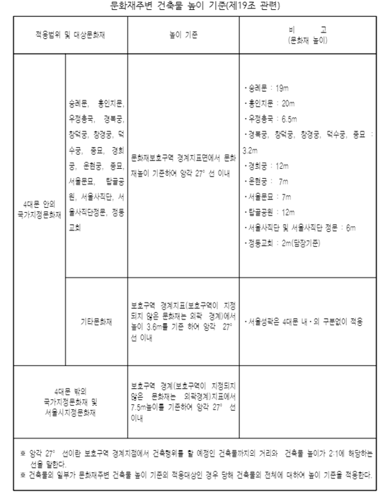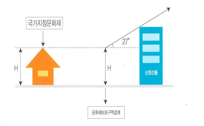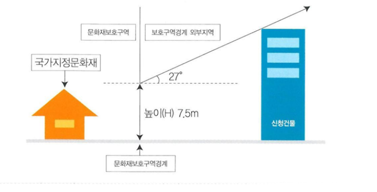 사이트 주변 문화재의 종류가 무엇이냐에 따라 주변 건물들의 다르게 높이제한을 받는다. 문화재가 속한 보호구역경계의 지표면으로부터 해당되는 높이를 띄운다음, 그 경계지점에서 보호구역의 외부지역으로 앙각 27도 선 내부로 높이를 제한한다.