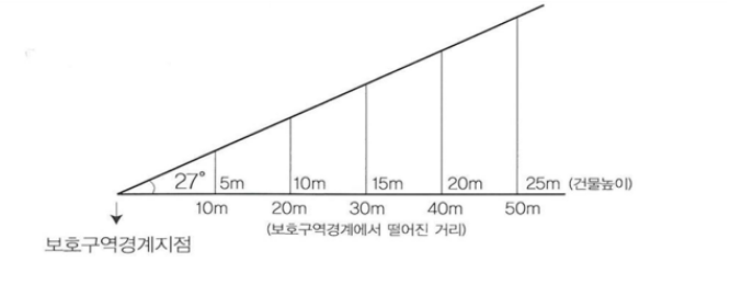 * 앙각 27도 선이란 : 보호구역의 경계지점에서 건축행위를 할 예정인 건축물까지의 거리와 건축물의 높이가 2:1인 선을 말한다.