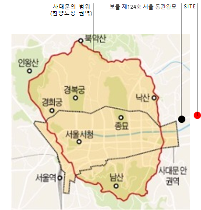 사이트 주변 문화재가 사대문 안에 있고 없고에 따라 주변건물을 제한하는 높이가 달라진다. 대상지 주변에 있는 문화재가 어디에 있는지 위치를 아는 것이 중요한 이유이다. 사대문의 범위는 건축법상으로 지정되어있지는 않으나, 서울시도시계획 상에 한양도성 권역으로 명시되어 있다.