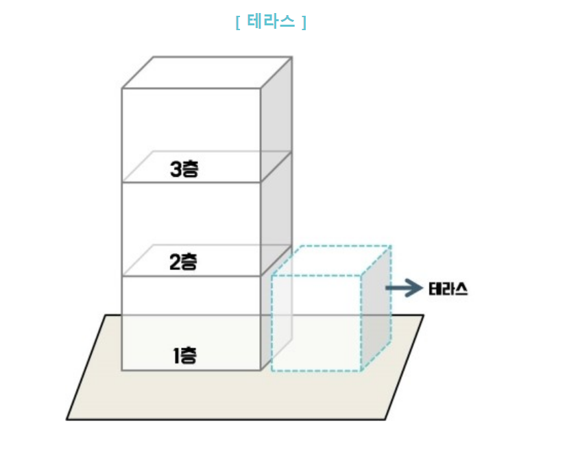 - 테라스 : 지표면과 만나는 부분에 성토된 부분을 뜻한다. 쉽게 표현하자면, '1층에 마련된 발코니'라고 생각하면 된다. 구조물 설치보다는, 땅을 돋아 흙을 밟지 않도록 마감을 하며, 지붕은 설치안하는 것이 일반적이다. 실내바닥보다 낮아야 정원으로 꾸밀 수 있으며, 실내 방수를 위해 마감면을 20cm 정도 낮게 조성한다. 1층의 거실이나 식당 등에서 바로 연결될 수 있어야 하며, 테라스 확장 또한 위법이며, 지붕이 없다면 바닥면적 산정은 제외된다. 지붕이 있다면 그것은 차양으로 간주하여, 차양 끝선으로부터 안쪽으로 1m까지만 바닥면적 제외된다.
