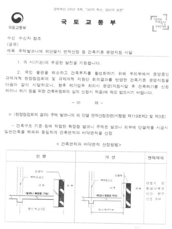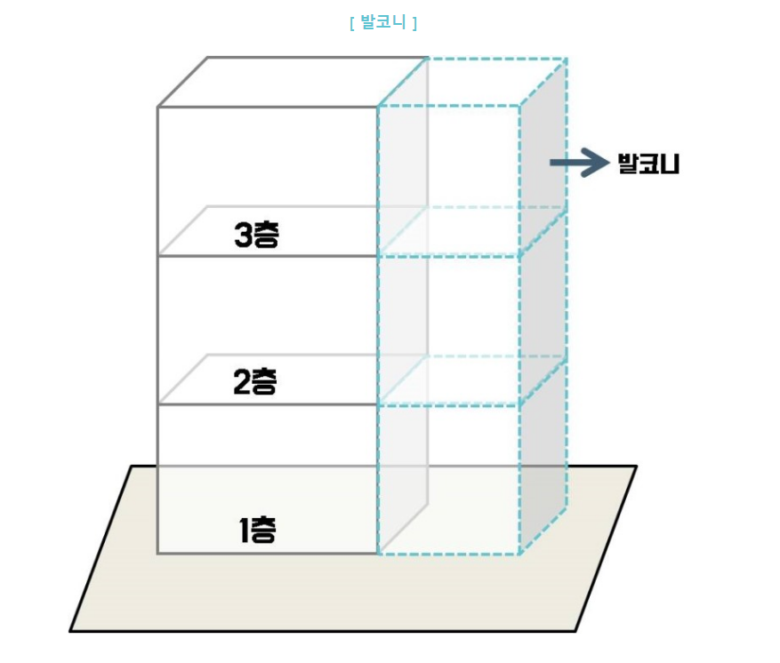 | 「건축법 시행령」제2조 제1항 제14호 14 “발코니”란 건축물의 내부와 외부를 연결하는 완충공간으로서 전망 이나 휴식 등의 목적으로 건축물 외벽에 접하여 부가적으로 설치되는 공간을 말한다. 이 경우 주택에 설치되는 발코니로서 *국토교통부장관이 정하는 기준 에 적합한 발코니는 필요에 따라 거실․침실․창고 등의 용도로 사용할 수 있다. |