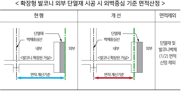 - 확장형 발코니(외단열) : 외측 벽체 중심선으로부터 바닥면적 및 건축면적 산정