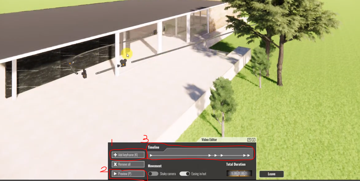 1. Add keyframe : Walk 모드 등으로 돌아다니며 보여주고 싶은 장면마다 단축키 K 를 눌러 장면추가 (Add keyframe) 할 수 있다.