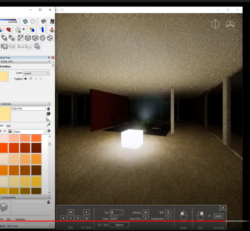 스케치업의 Shadow 탭에서 시간을 설정할 수 있다. 오후 7시 정도 설정하면 화면이 완전히 까매진다. (Auto Exposure을 켜면 어두운 상태에서 별과 함께 화면이 보이지만, 일단 꺼둔다)