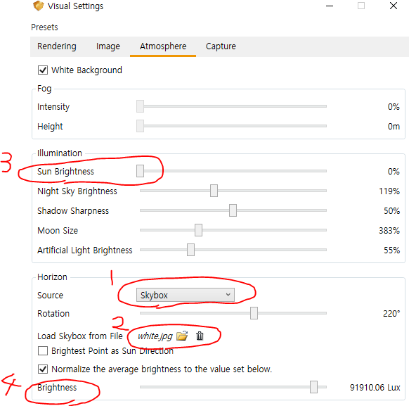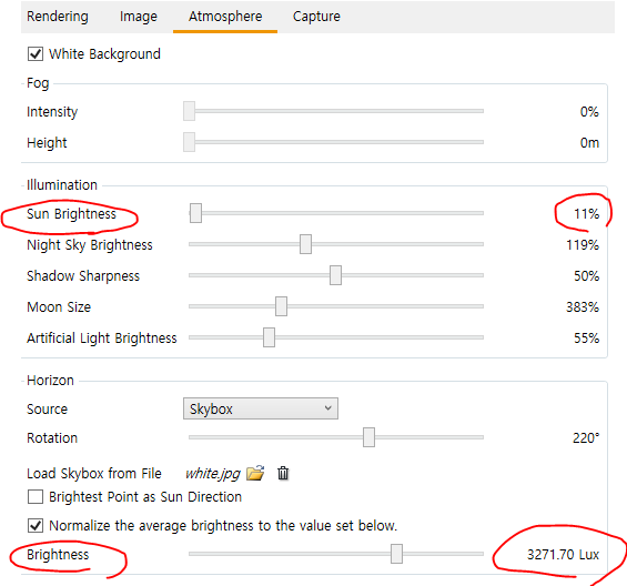 Sun brightness가 올라감으로 그림자가 생기게되고, Horizon의 Brightness를 조절해서 밝기를 조절해주자.