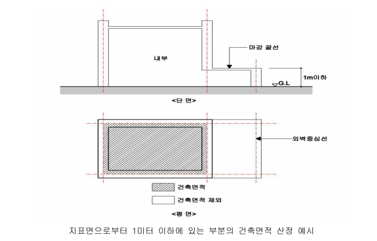 - 건축면적 제외7(지표면으로부터 1m 이하에 있는 부분 / 차량 입출고 접안부는 1.5m 이하에 있는 부분)